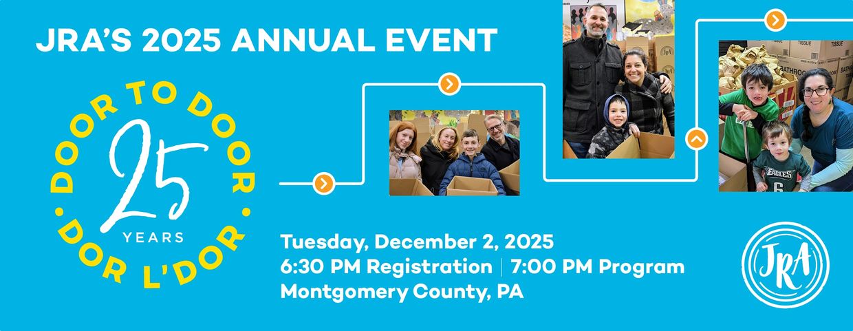 Join us for JRA’s 2025 Annual Event to End Hunger: Door to Door / Dor L’Dor – Celebrating 25 Years of JRA, on Tuesday, December 2nd. Let’s celebrate the past, take action in the present, and build a future where no neighbor goes hungry.
